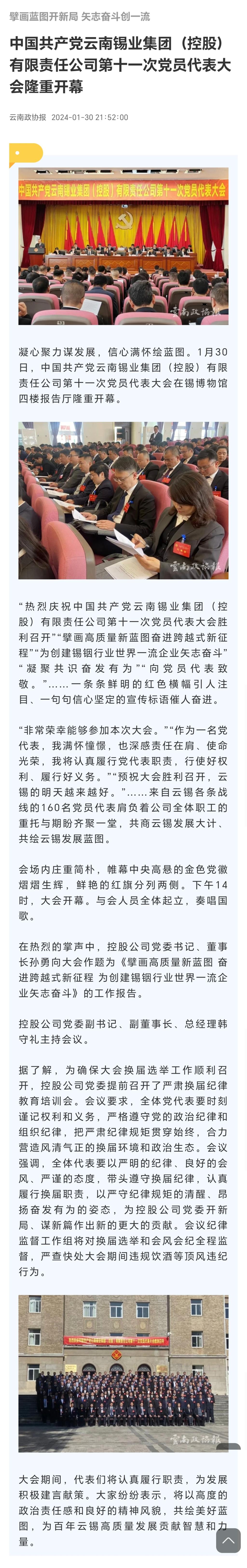 云南政協報:中國共產黨云南錫業集團(控股)有限責任公司第十一次黨員代表大會隆重開幕