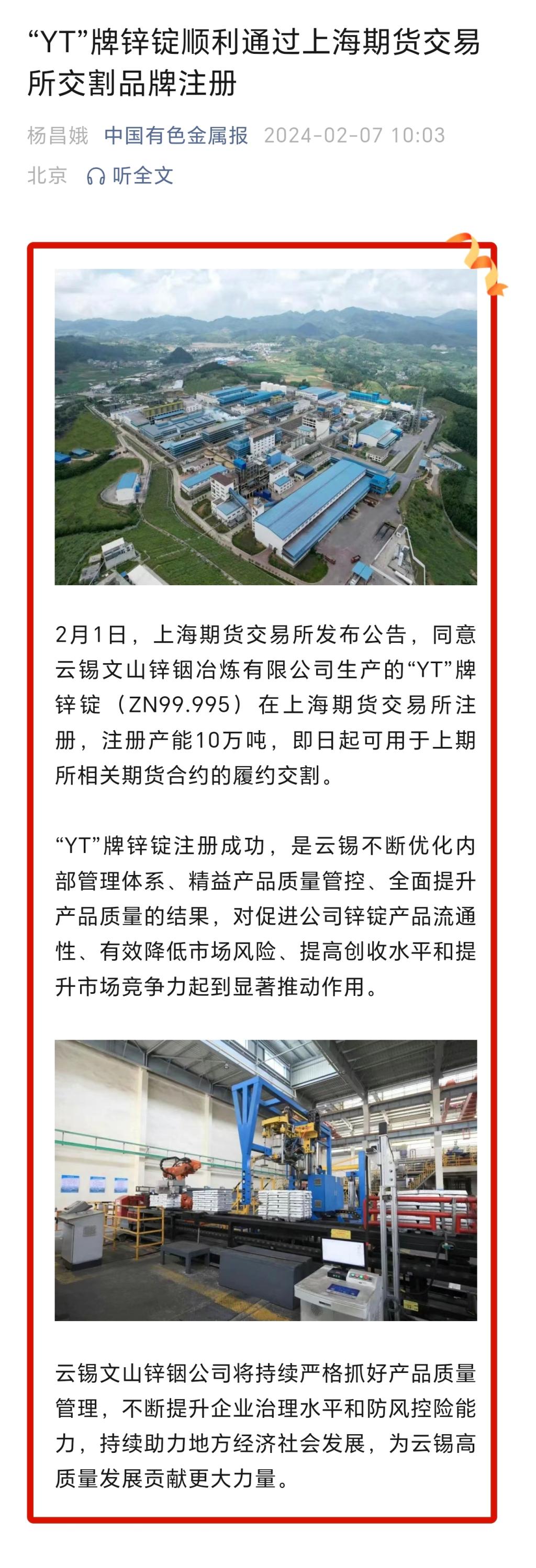 中國有色金屬報:“YT”牌鋅錠順利通過上海期貨交易所交割品牌注冊
