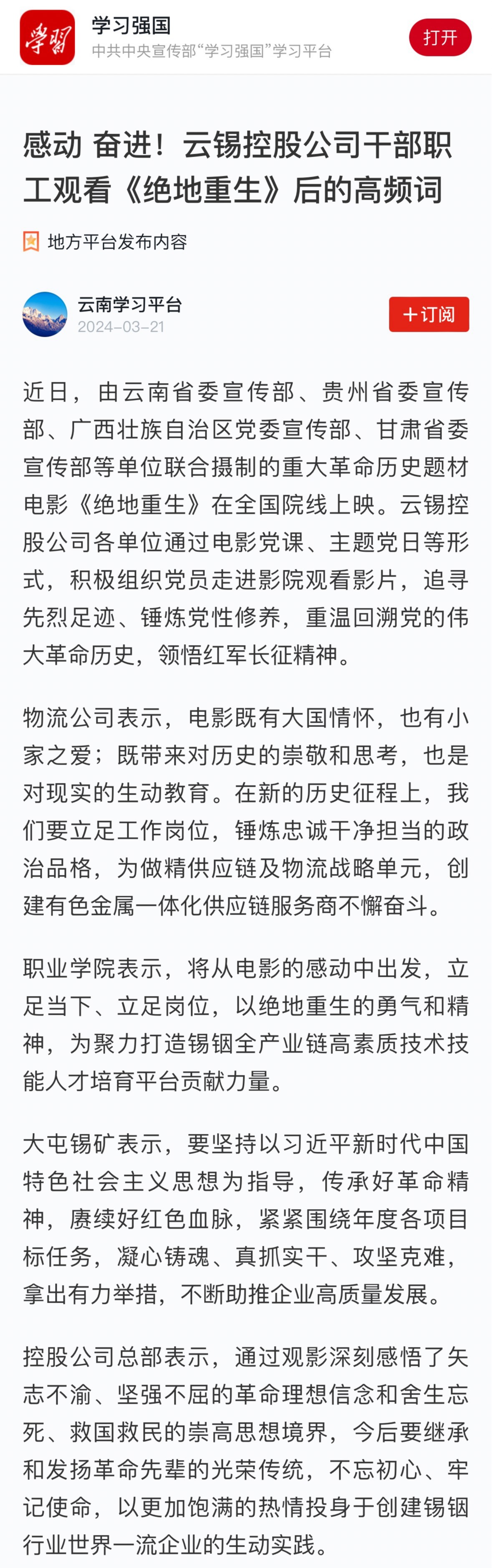 學習強國:感動 奮進!云錫控股公司干部職工觀看《絕地重生》后的高頻詞