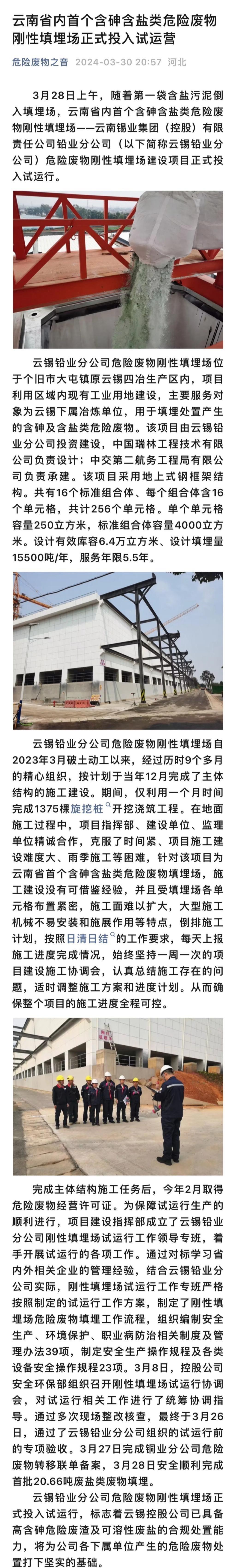 危險廢物之音:云南省內首個含砷含鹽類危險廢物剛性填埋場正式投入試運營
