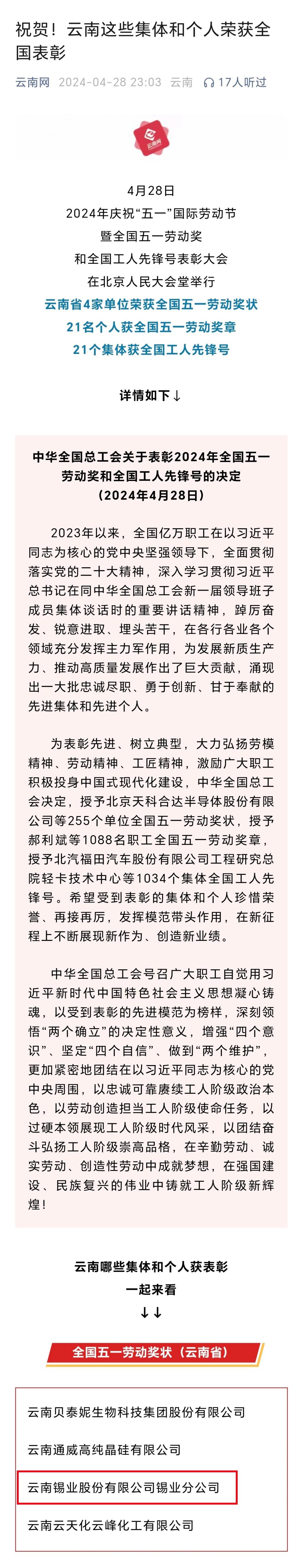 喜報!錫業分公司榮獲全國五一勞動獎狀