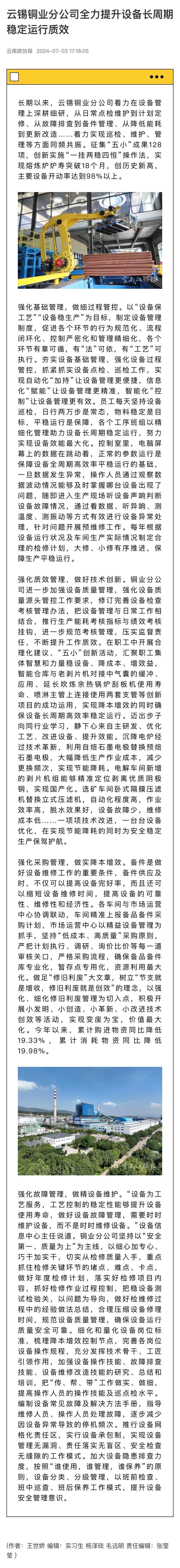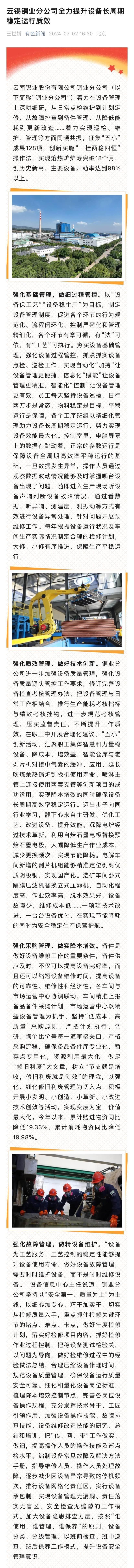 云南政協報、有色新聞:云錫銅業分公司全力提升設備長周期穩定運行質效
