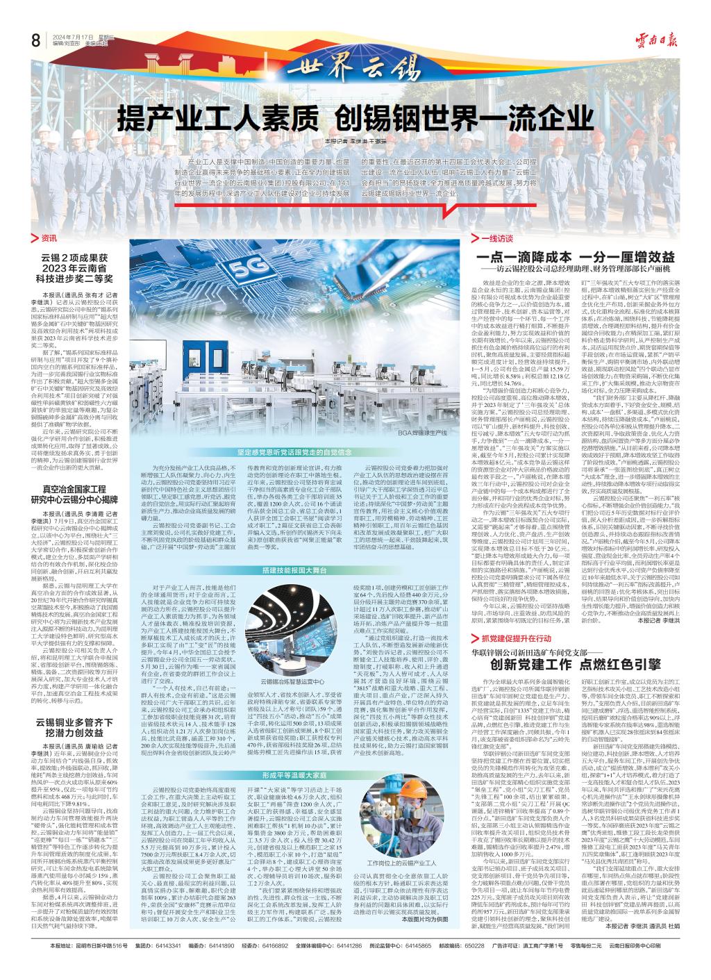“通過黨組織建設,打造一流技術工人隊伍,不斷塑造發(fā)展新動能新優(yōu)勢。”劉俊告訴記者,云錫控股公司不斷健全工人技能培養(yǎng)、使用、評價、激勵制度,打破職稱、收入和上升通道“天花板”,為人人皆可成才、人人盡展其才營造良好環(huán)境。圍繞云錫“3815”戰(zhàn)略和重大戰(zhàn)略、重大工程、重大項目、重點產(chǎn)業(yè),廣泛深入持久開展具有產(chǎn)業(yè)特色、單位特點的勞動競賽,強化集智創(chuàng)新平臺作用發(fā)揮,深化“四技五小兩比”等群眾性技術創(chuàng)新活動,積極承擔錫銦領域戰(zhàn)略性國家重大科技任務,聚力攻關錫銦全產(chǎn)業(yè)鏈關鍵核心技術,推動高水平科技成果轉(zhuǎn)化,助力云錫打造國家錫銦產(chǎn)業(yè)技術創(chuàng)新高地。