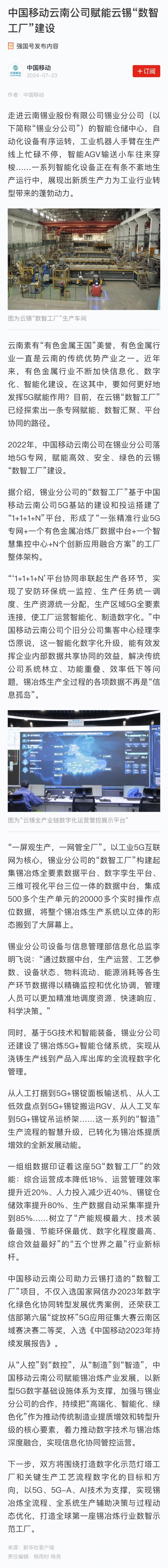 強(qiáng)國號(hào):中國移動(dòng)云南公司賦能云錫“數(shù)智工廠”建設(shè)