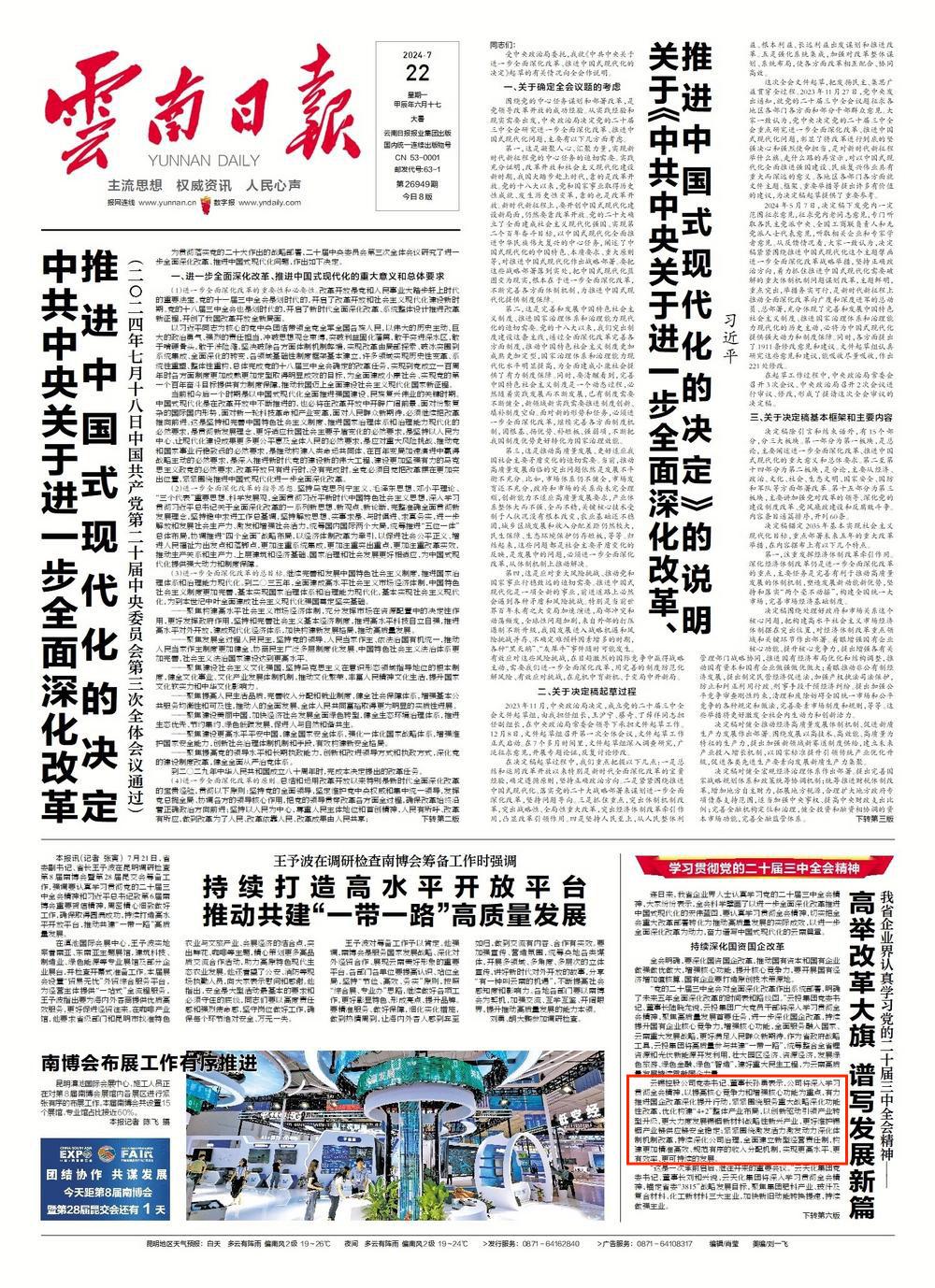 連日來,我省企業界人士認真學習黨的二十屆三中全會精神,大家紛紛表示,全會科學擘畫了以進一步全面深化改革推進中國式現代化的宏偉藍圖,要認真學習貫徹全會精神,切實把全會重大改革部署轉化為推動高質量發展的實際成效,以進一步全面深化改革為動力,奮力譜寫中國式現代化的云南篇章。
