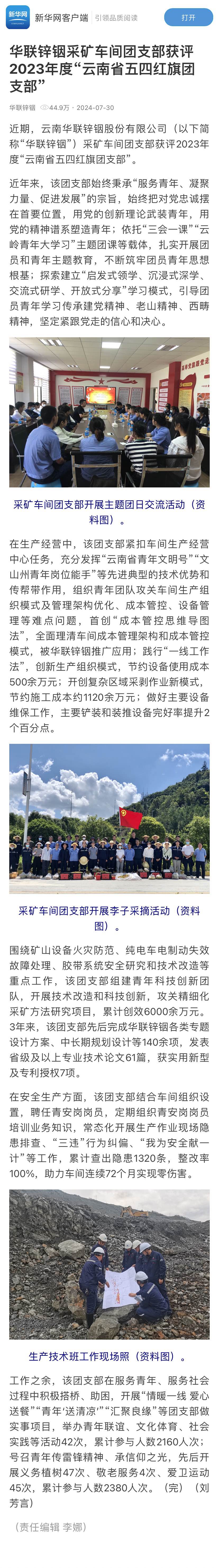 新華網:華聯鋅銦采礦車間團支部獲評2023年度“云南省五四紅旗團支部”