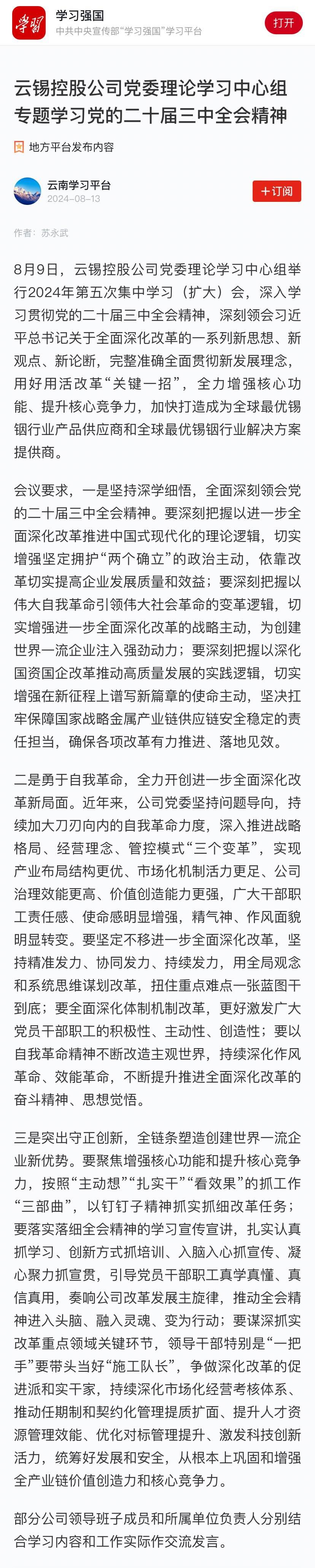 學習強國:云錫控股公司黨委理論學習中心組專題學習黨的二十屆三中全會精神