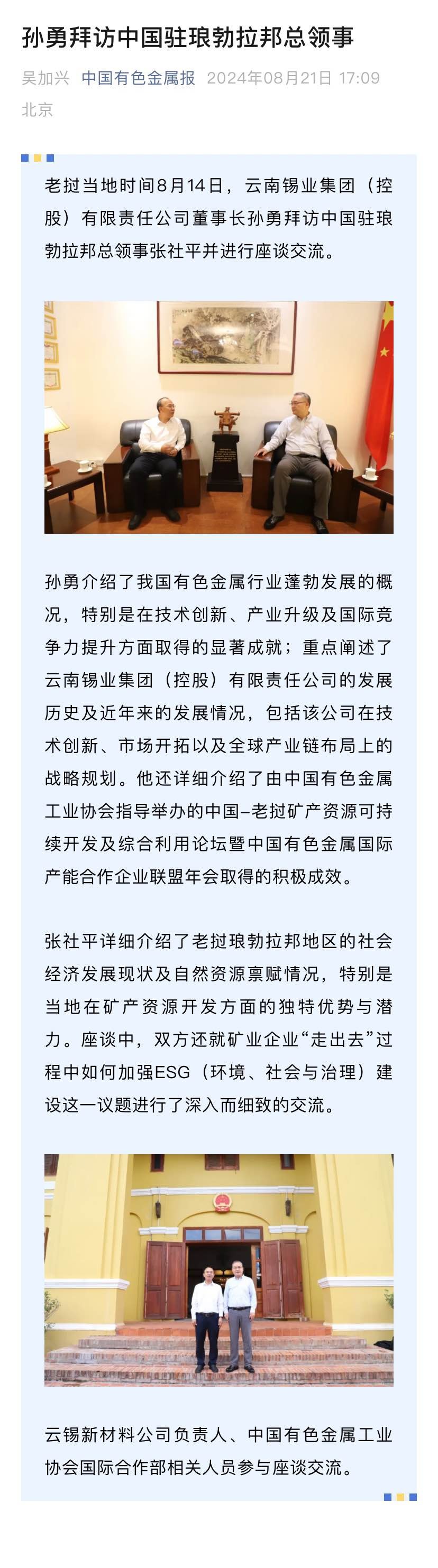 中國有色金屬報:孫勇拜訪中國駐瑯勃拉邦總領事