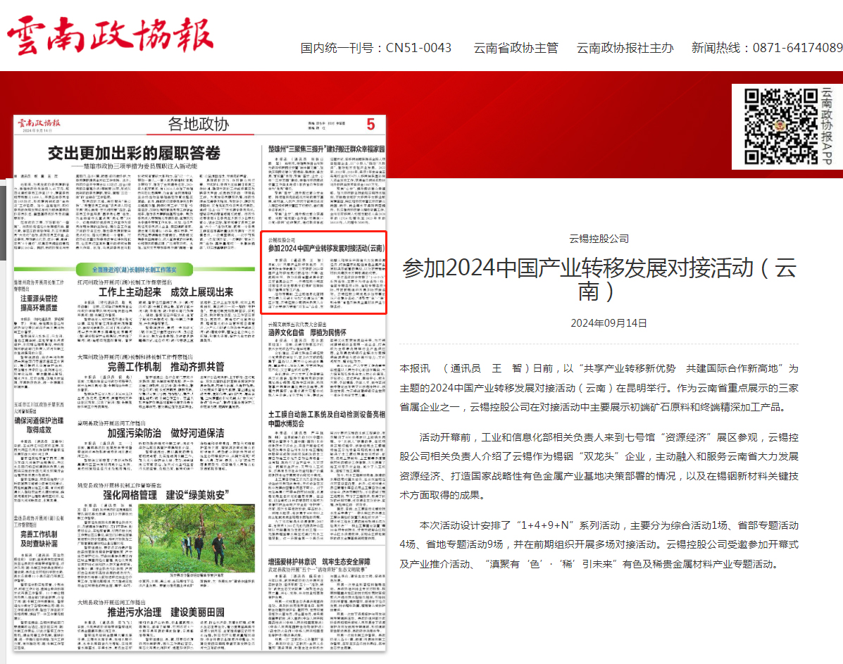 云南政協報:云錫參加2024中國產業轉移發展對接活動(云南)