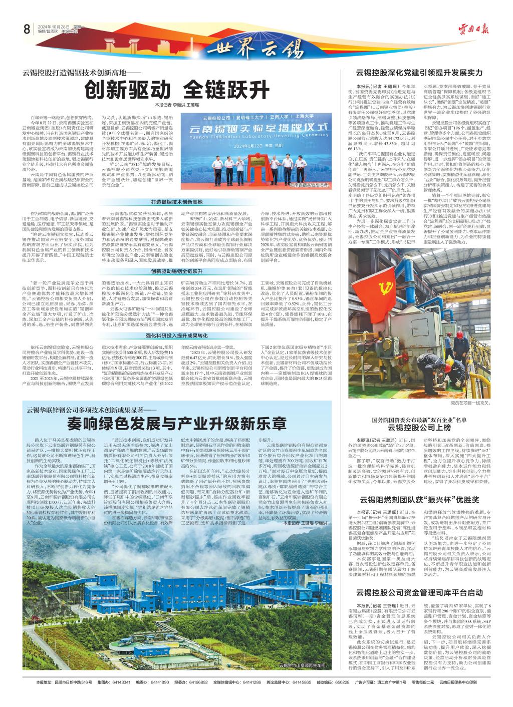 錨定云南“3815”戰(zhàn)略發(fā)展目標(biāo),云錫控股公司黨委正立足錫銦資源稟賦和產(chǎn)業(yè)優(yōu)勢,以創(chuàng)新驅(qū)動錫、銦全產(chǎn)業(yè)鏈躍升,加速創(chuàng)建“世界一流企業(yè)”。