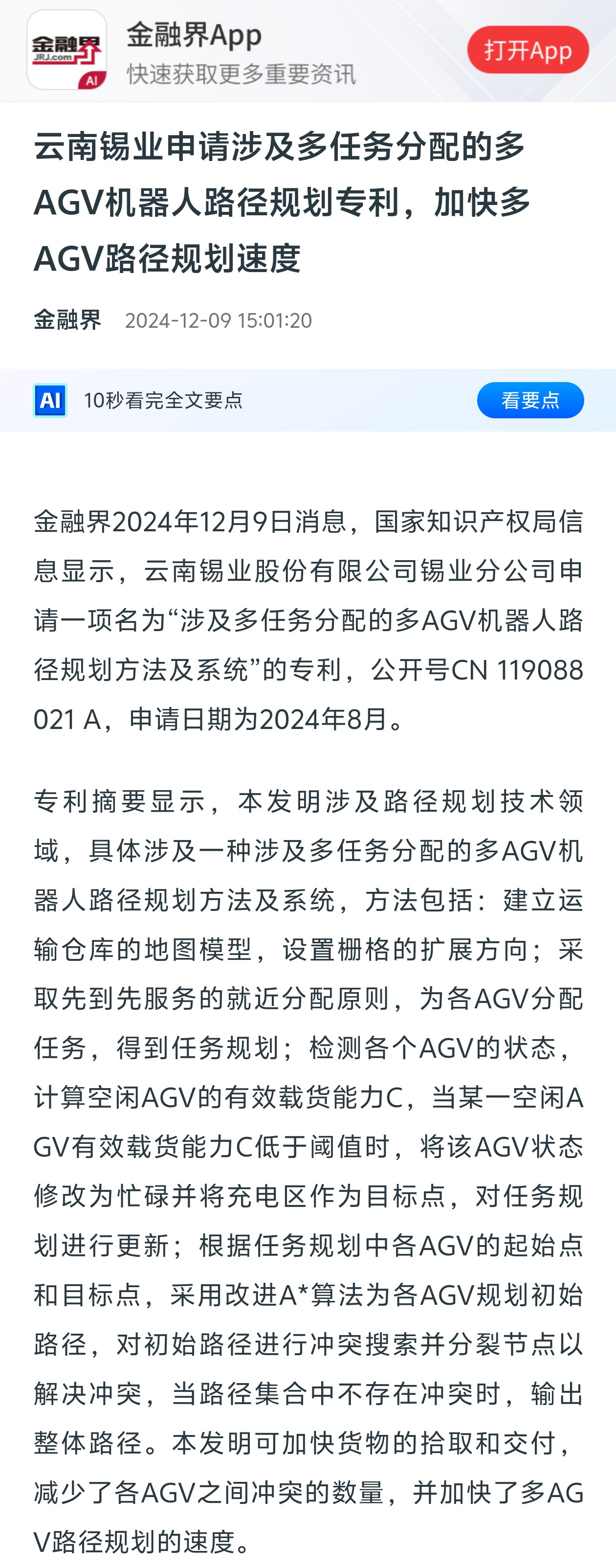 金融界:云南錫業申請涉及多任務分配的多AGV機器人路徑規劃專利,加快多AGV路徑規劃速度