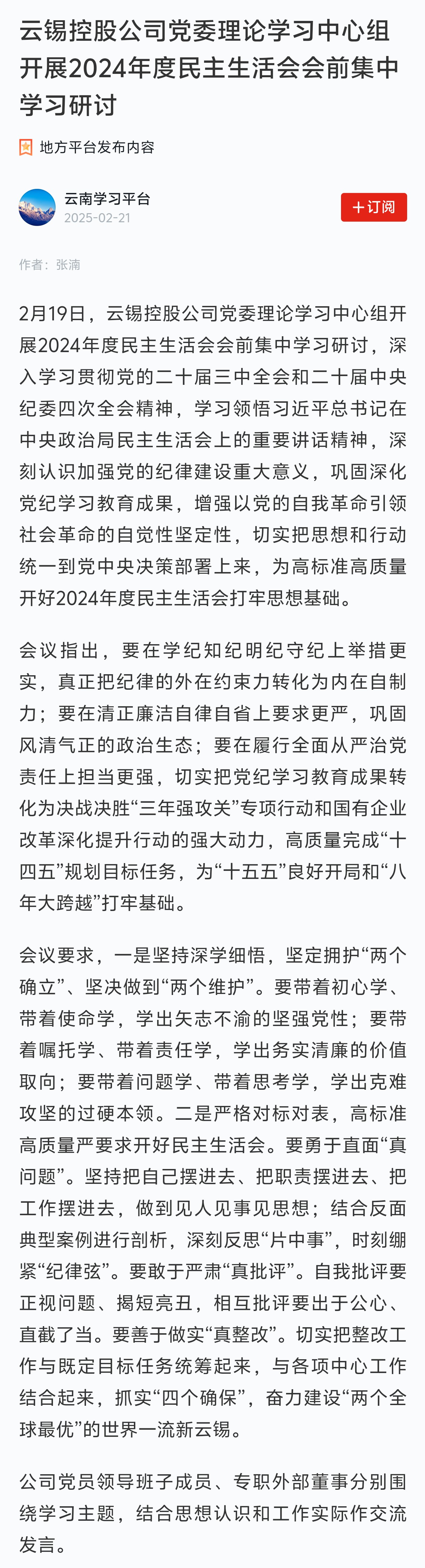 學習強國:云錫控股公司黨委理論學習中心組開展2024年度民主生活會會前集中學習研討