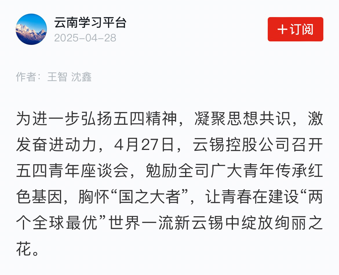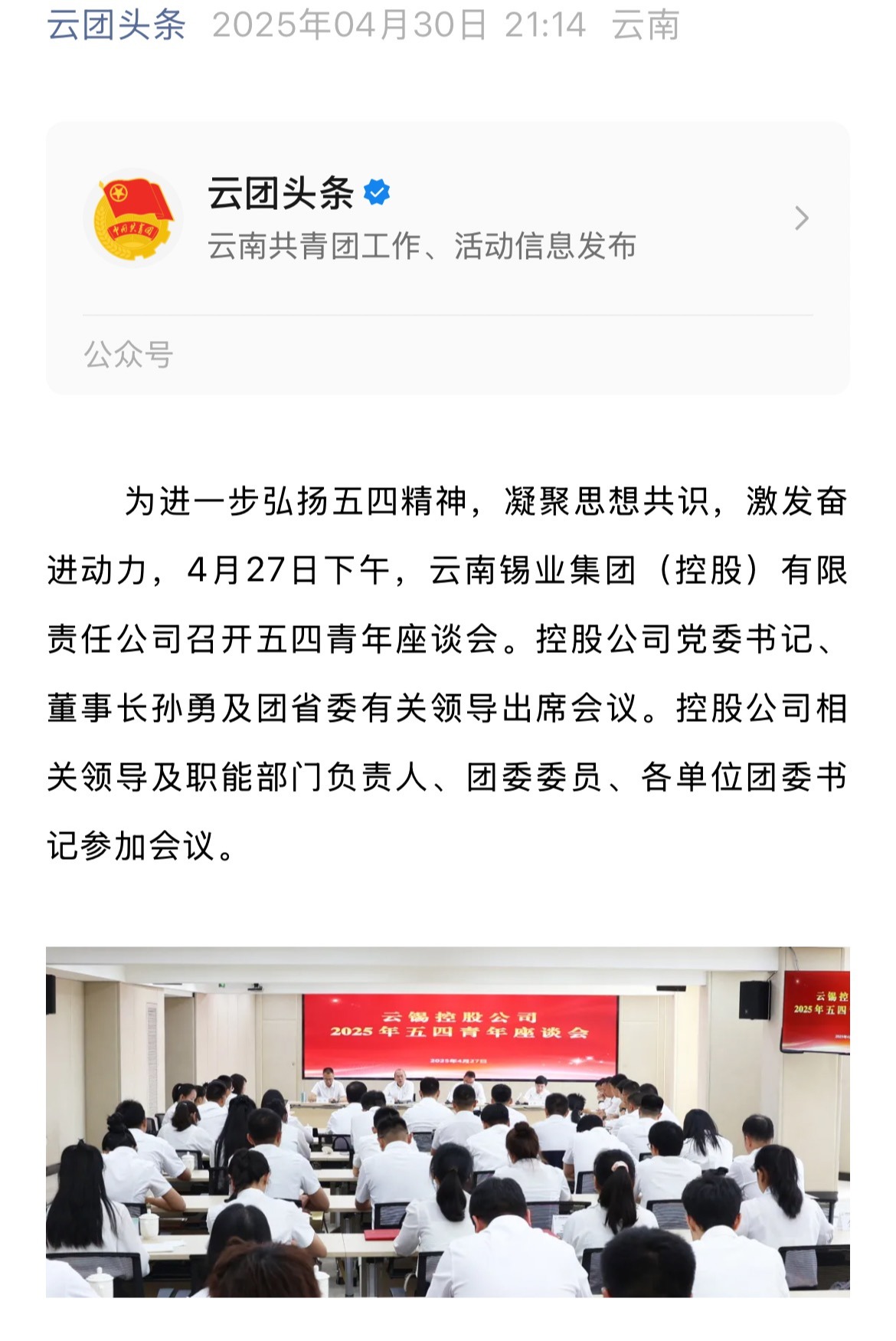 學習強國、云團頭條:云錫控股公司召開五四青年座談會