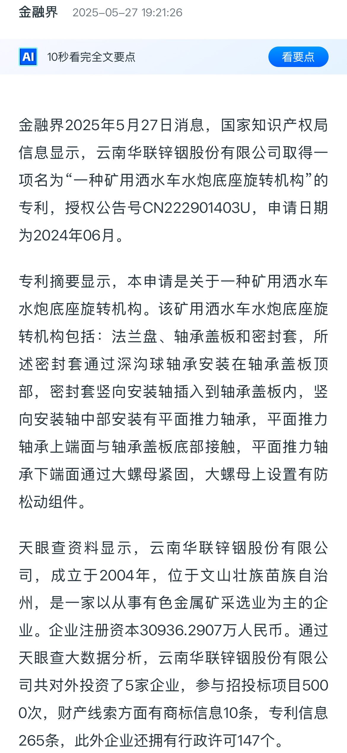 金融界:云南華聯(lián)鋅銦取得礦用灑水車(chē)水炮底座旋轉(zhuǎn)機(jī)構(gòu)專(zhuān)利,能夠解決水炮使用壽命短的問(wèn)題
