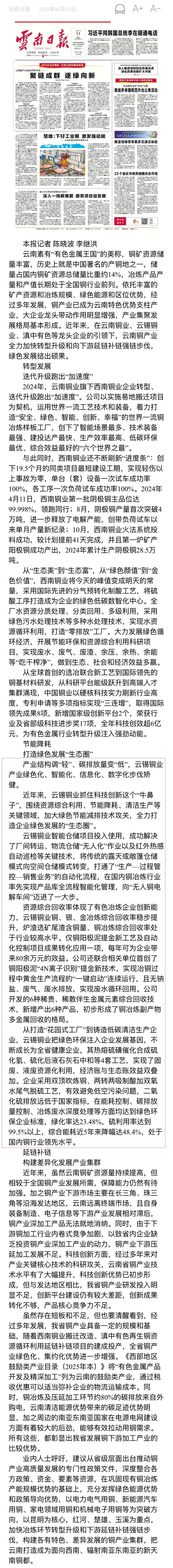云南日報、云新聞:云南銅產業加快轉型升級——聚鏈成群 逐綠向新
