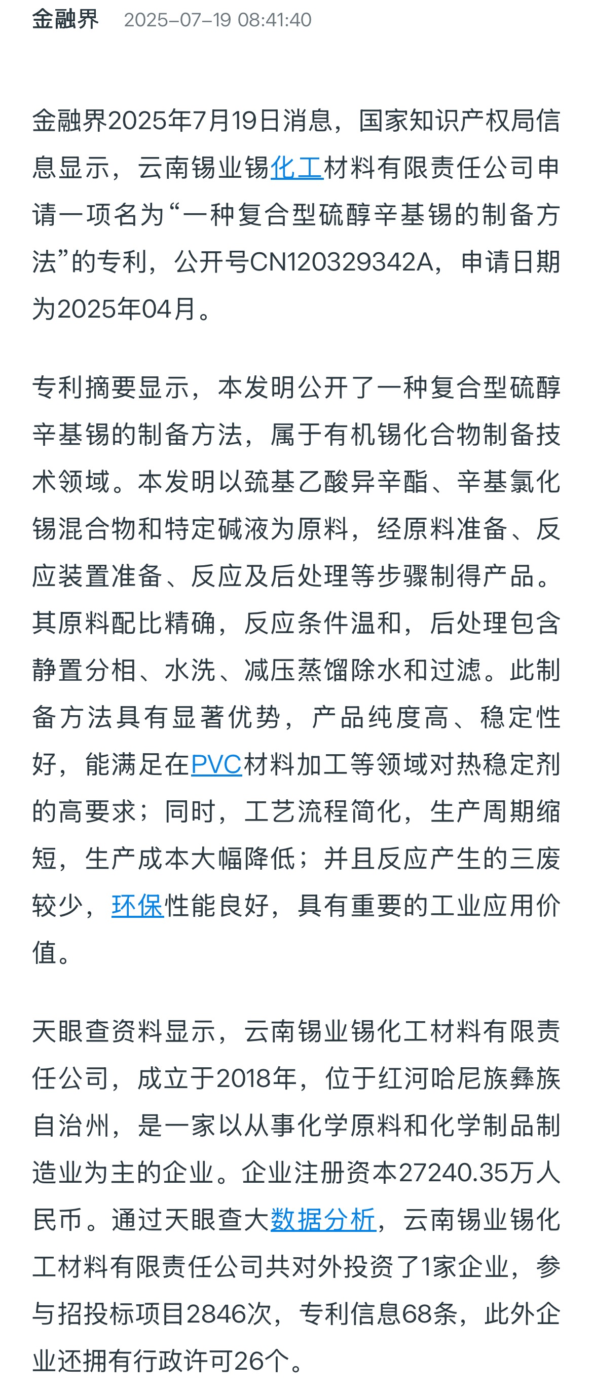 金融界:云南錫業申請復合型硫醇辛基錫制備方法專利,產品純度高