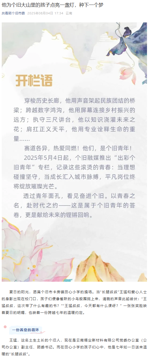 錫都個舊、共青團個舊市委:他為個舊大山里的孩子點亮一盞燈,種下一個夢