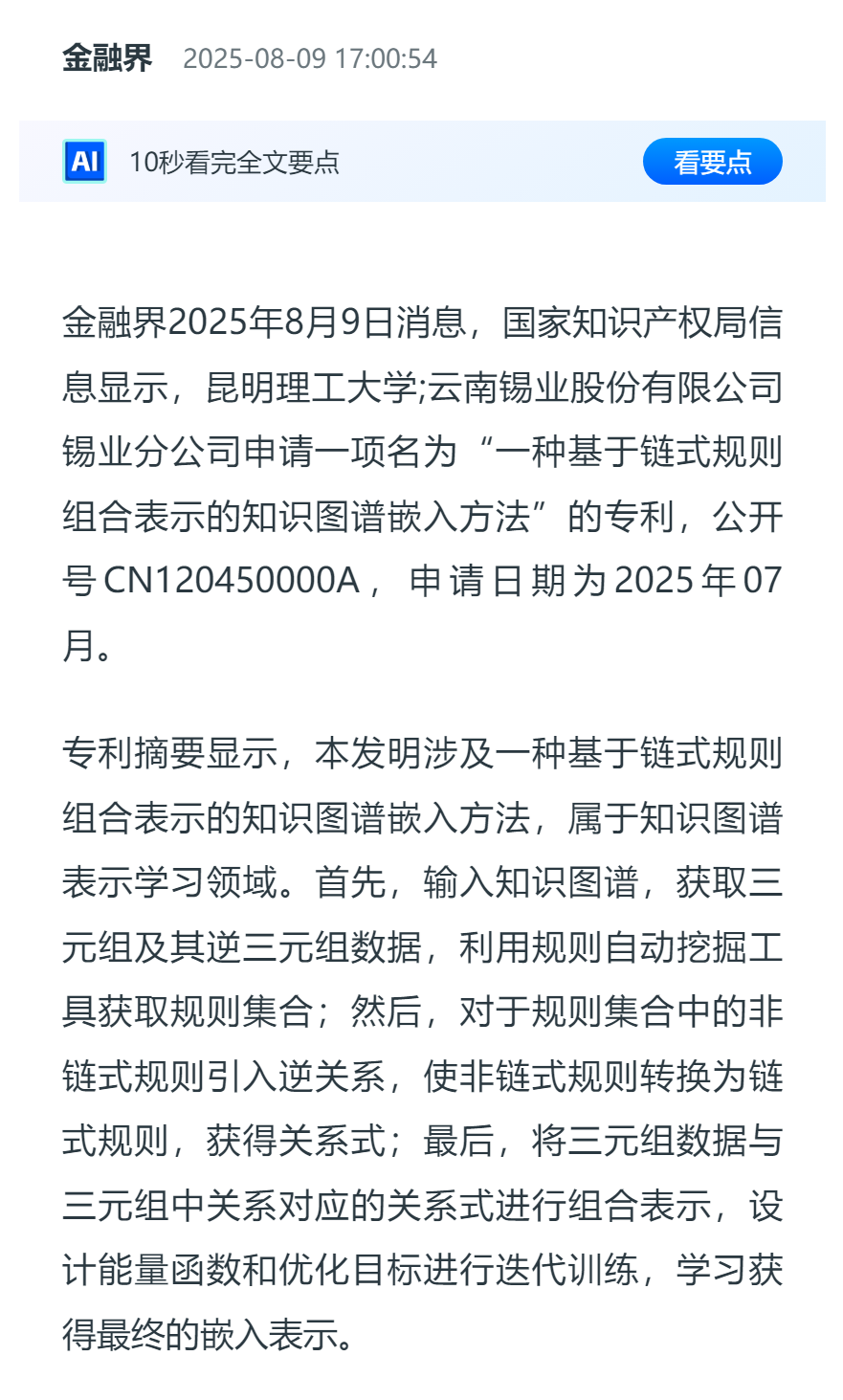 金融界:昆明理工大學等申請一種基于鏈式規則組合表示的知識圖譜嵌入方法專利,提高知識圖譜嵌入表示能力