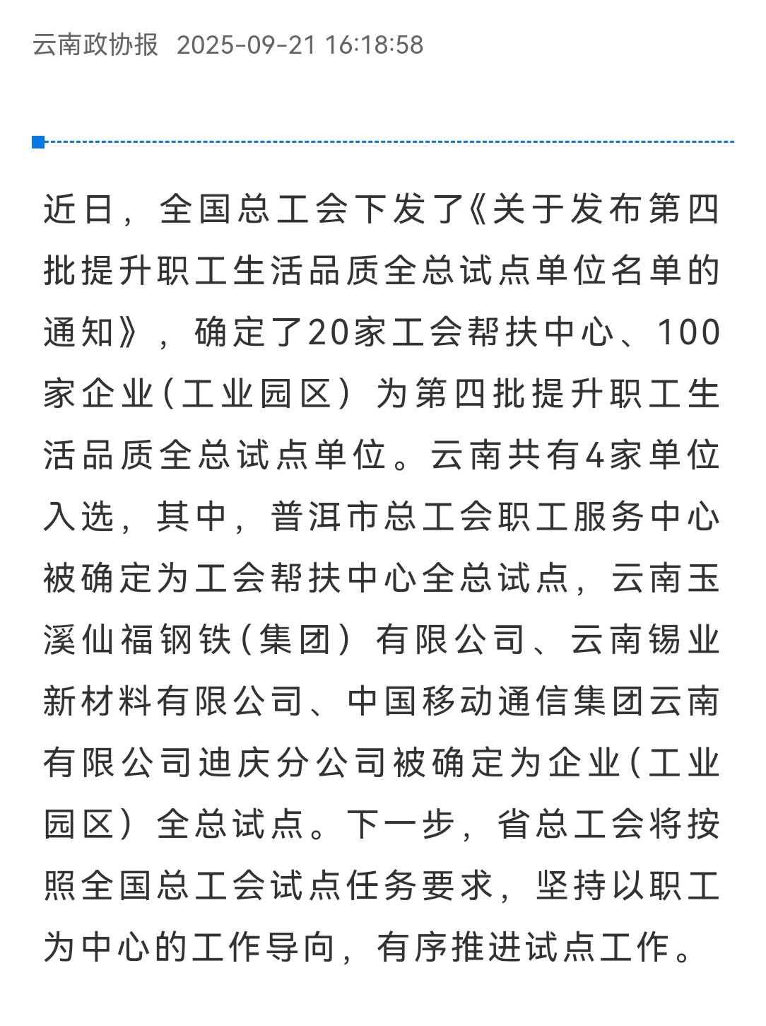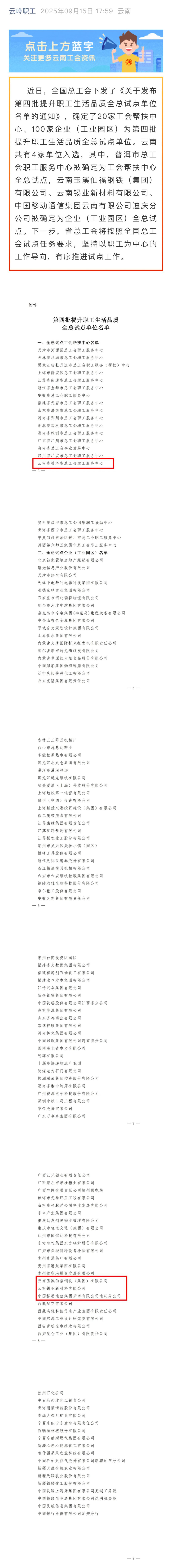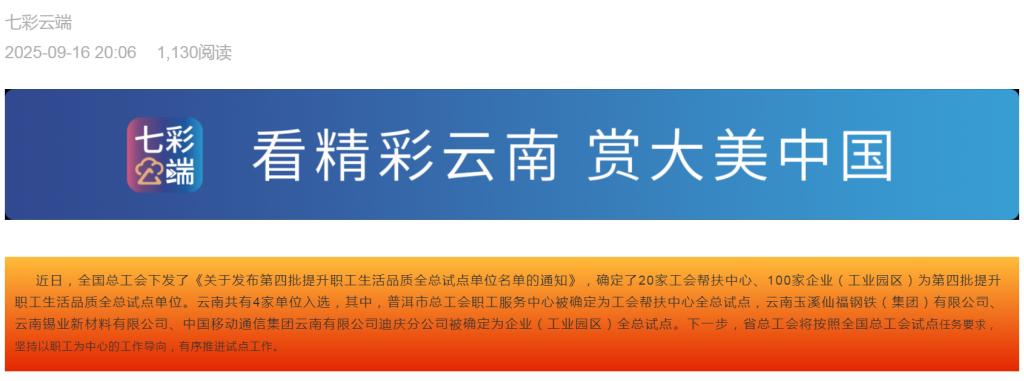 云嶺職工、七彩云端、云南政協報:喜報!云南4家單位被確定為第四批提升職工生活品質全總試點!