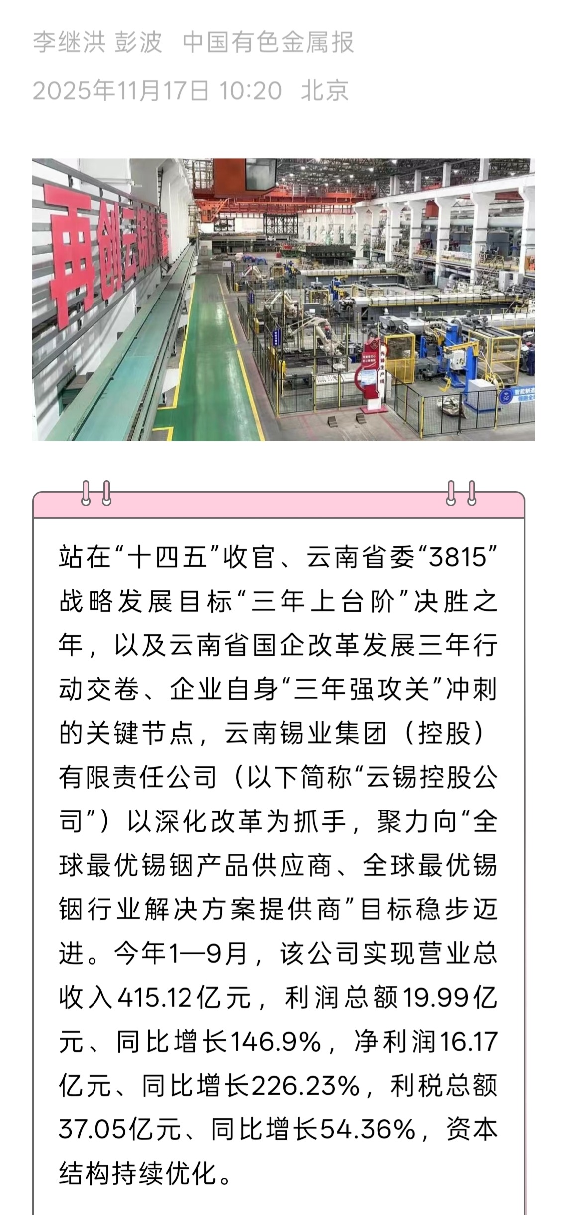 站在“十四五”收官、省委“3815”戰略發展目標“3年上臺階”決勝之年、全省國企改革發展三年行動交卷、云錫自身“三年強攻關”沖刺的關鍵節點,云南錫業集團(控股)有限責任公司正以深化改革為抓手,聚力向“全球最優錫銦產品供應商、全球最優錫銦行業解決方案提供商”穩步邁進。2025年1至9月,云錫控股實現營業總收入415.12億元、利潤總額19.99億元,同比增長146.9%;凈利潤16.17億元,同比增長226.23%;利稅總額37.05億元,同比增長54.36%,資本結構持續優化。