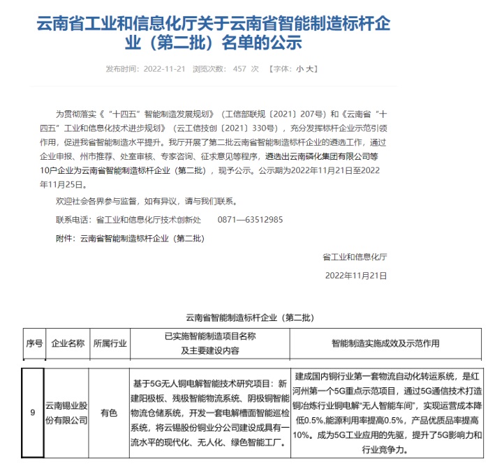 近日,云南省工業和信息化廳發布了云南省智能制造標桿企業(第二批)名單,共遴選10家企業,錫業股份成功入選。