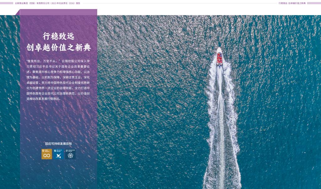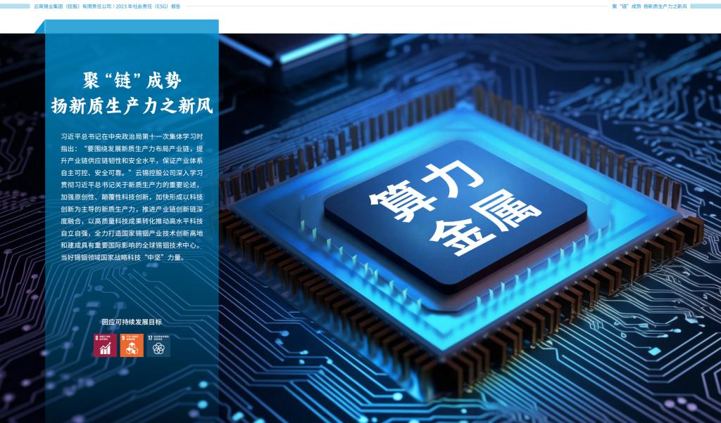 《報告》主體部分設“行穩致遠 創卓越價值之新典”“聚‘鏈’成勢 揚新質生產力之新風”“山水與共 展只此青綠之新顏”“大道同行 譜和衷共濟之新曲”四個篇章,與總標題“新”字相呼應,全方位總結云錫環境(E)、社會(S)、治理(G)及價值創造(V)多維度的實踐成果,全面回應聯合國可持續發展目標和利益相關方關注重點,充分展示云錫聚焦高質量發展主線,在融入新發展階段、貫徹新發展理念、構建新發展格局中的積極作為。