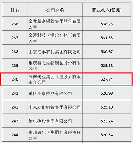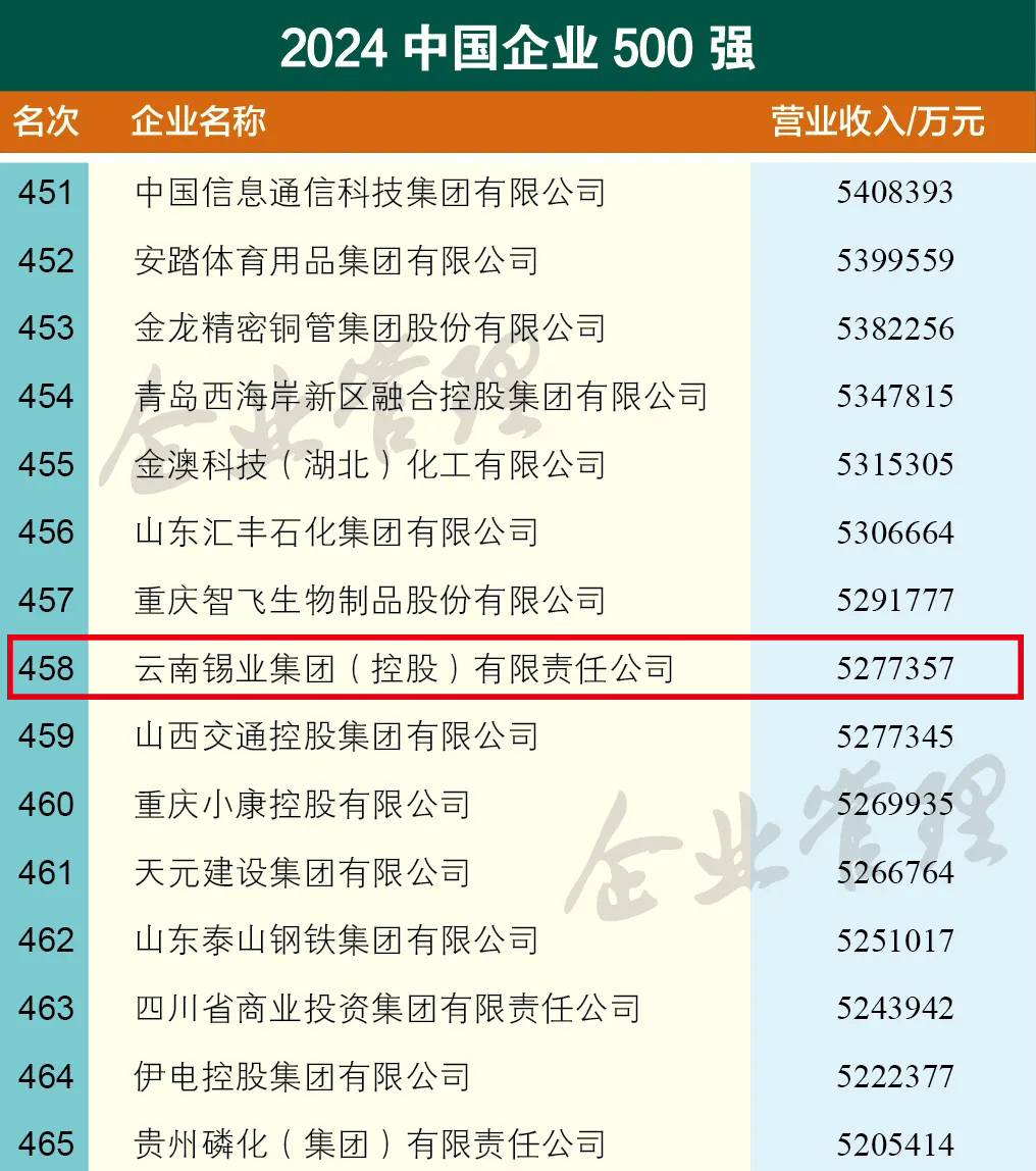 日前,中國企業聯合會、中國企業家協會聯合發布2024中國企業500強、中國制造業企業500強榜單。云錫位列2024中國企業500強第458位、中國制造業企業500強第240位。