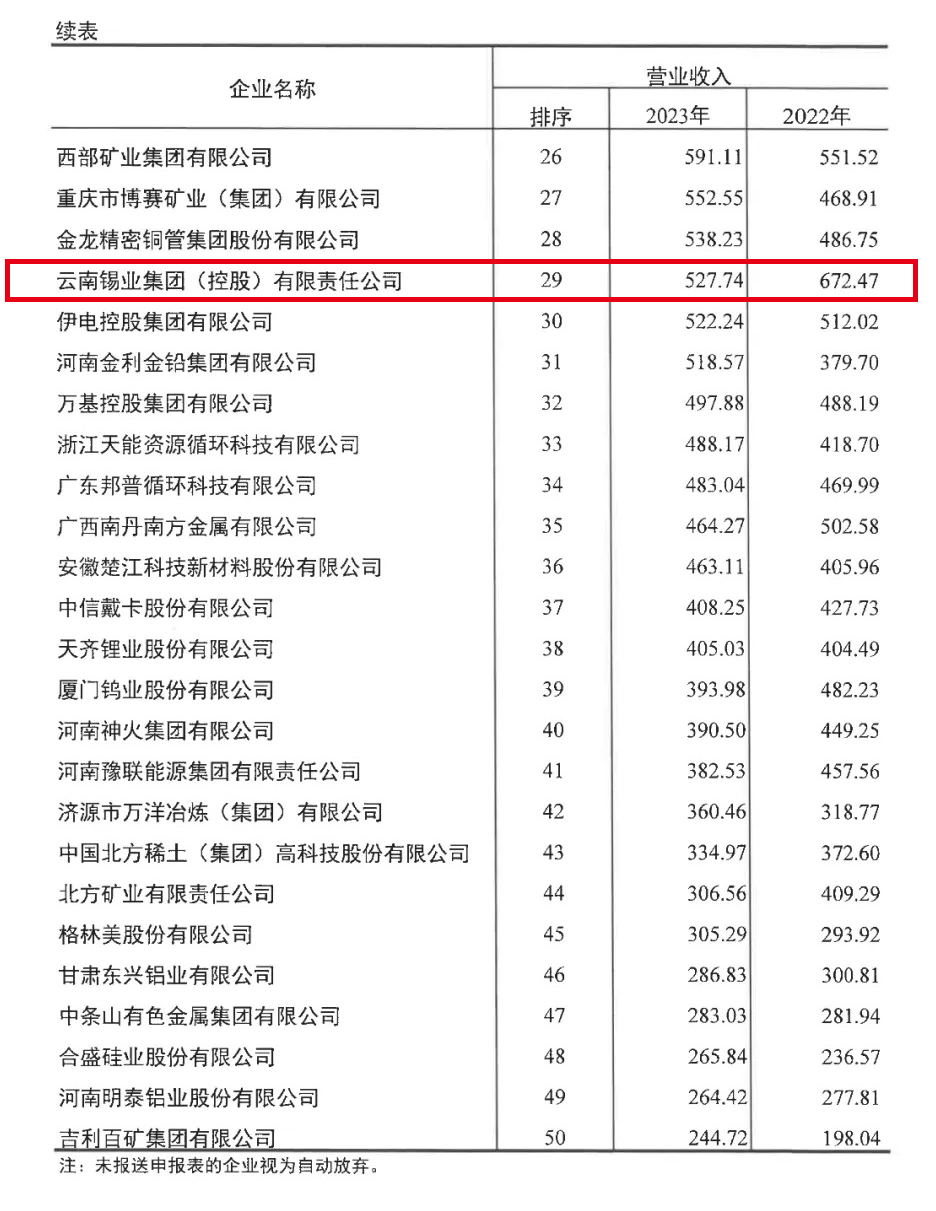 在中國有色金屬工業協會發布的2023年有色金屬企業50強榜單中,云錫位列第29位。