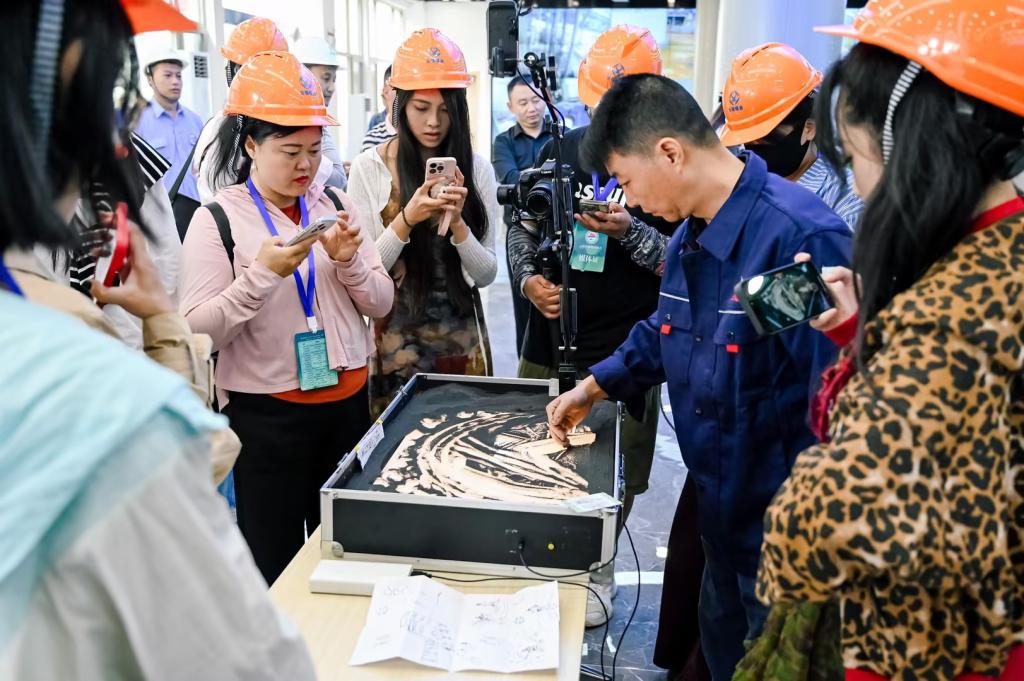 期間,錫業(yè)分公司在智慧運(yùn)營(yíng)中心打卡點(diǎn)開(kāi)展沙畫(huà)創(chuàng)作展示。云錫文聯(lián)沙畫(huà)作家在尺寸之間,如同放映機(jī)般,把錫冶煉廠貌、錫錠產(chǎn)品、直線澆鑄工業(yè)機(jī)械臂等代表性鏡頭揮沙成畫(huà)、栩栩如生,吸引眾多來(lái)賓打卡拍攝。
