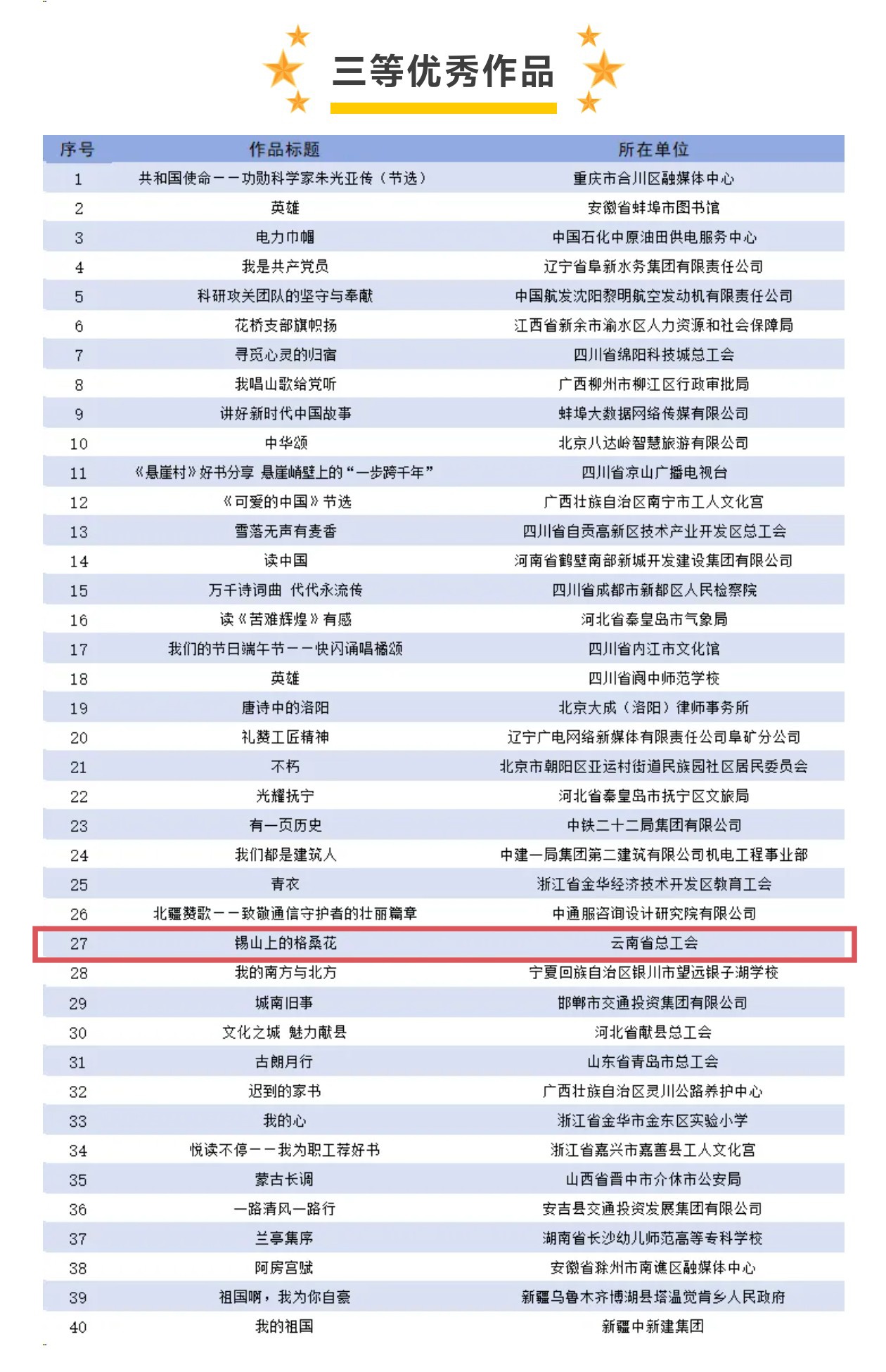 又訊:12月31日,全國總工會宣傳教育部公布“閱讀經典好書 爭做中國好網民”主題誦讀活動優秀作品名單,全國共評選出優秀誦讀作品90部,云南省有兩個作品入圍獲獎名單,云錫工會選送的《錫山上的格桑花》榮獲全國主題活動誦讀類作品三等獎。