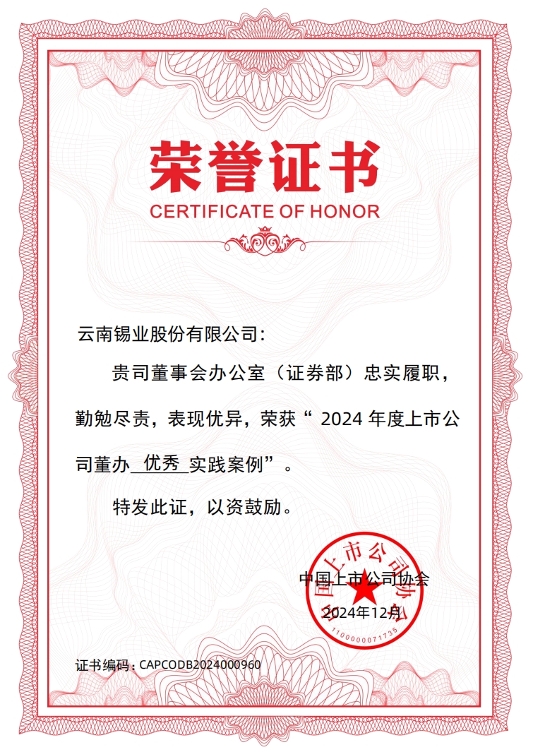 此次獲獎(jiǎng)體現(xiàn)了中國上市公司協(xié)會(huì)以及資本市場(chǎng)對(duì)錫業(yè)股份董辦工作的充分肯定和高度認(rèn)可。面向未來,錫業(yè)股份董辦將持續(xù)優(yōu)化公司治理體系,提升信息披露質(zhì)量和ESG管理水平,推動(dòng)公司可持續(xù)高質(zhì)量發(fā)展,努力為廣大股東及各利益相關(guān)方創(chuàng)造更多價(jià)值。