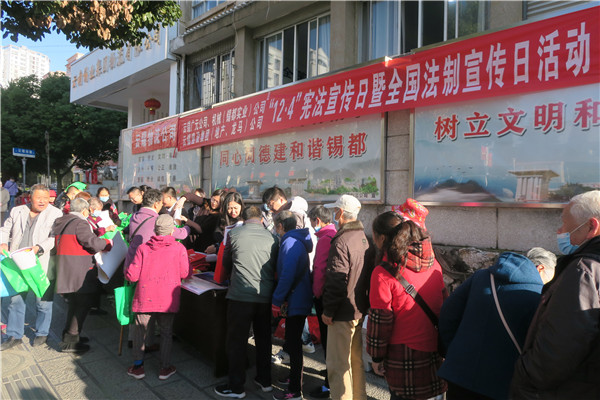 “憲法宣傳周”活動啟動后,控股公司以線上線下相結合的方式進行廣泛宣傳。線上利用公司內網、微信公眾號等新媒體平臺以圖文并茂的形式,全方位、多角度推送憲法知識、公益廣告及相關法治資訊。線下在職工較為集中的公共區域懸掛、張貼或滾動播放宣傳標語宣傳視頻,向廣大干部職工群眾宣傳憲法、民法典、習近平法治思想等相關知識。在礦山坑口,政企聯合懸掛宣傳橫幅、發放宣傳資料,面對面接受職工群眾咨詢,引導員工學法、知法、尊法、守法、用法。在車間班組,組織一線員工開展一次憲法學習,通過“憲法宣傳周,國家憲法日知多少?”在線答題趣味活動充分調動職工的學習積極性。在學校機關,邀請律師事務所相關專家作《憲法》《民法典》普法宣講,進一步擴大企業法治宣傳面。在公司宣傳欄和街道,云錫志愿者走上街頭發放宣傳資料,針對廣大職工和市民群眾關注的熱點、難點問題,設置宣傳咨詢臺,擺放憲法宣傳展板,以直觀的方式廣泛宣傳與職工群眾工作、生活密切相關的法律法規,讓大家切身感受法治對人民群眾日常生活的護航和保障作用。