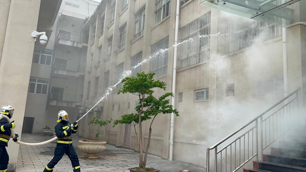 隨著演練模擬的火災煙霧開始蔓延,演練人員方案的要求按滅火行動組、通訊聯絡組、疏散引導組、安全救護組、安全警戒組、宣傳運輸保障組分工協作,保證了科技樓疏散人員用毛巾掩住口鼻,沿預定路線有序撤離,火災得以及時撲滅。
