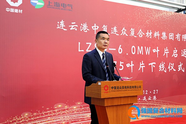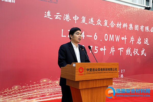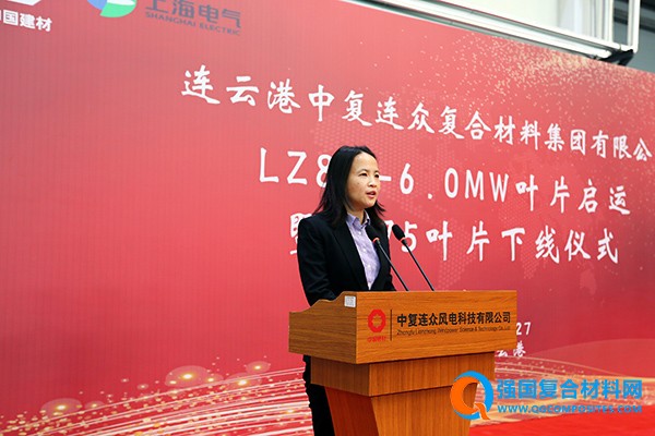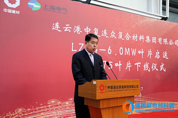 中復連眾集團黨委書記、總經理喬光輝、上海電氣風電集團總裁謝雪瓊分別代表合作雙方致辭,中國復材集團黨委書記、董事長、總經理劉標,連云港經濟技術開發區黨工委副書記、常務副主任胡傳宏對LZ84-6.0MW葉片啟運和B75葉片的成功下線表示祝賀。中復連眾集團副總經理、中復連眾風電科技有限公司總經理梁穎主持儀式。中國建材集團科技部總經理郅曉、業主代表、西門子技術團隊及中復連眾集團中層以上干部、中復連眾風電科技有限公司員工代表出席儀式。