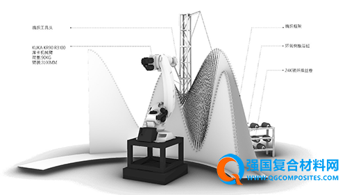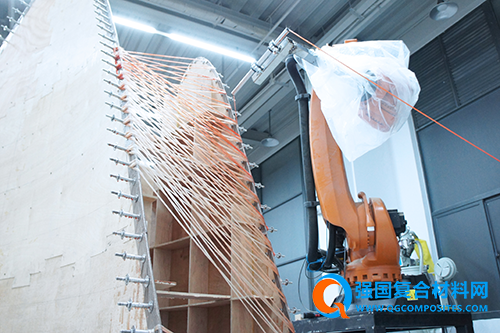 大界機器人率先引入歐洲最先進的機器人纖維編織建造技術(shù),并進行研發(fā)改進創(chuàng)造新的專利技術(shù)。數(shù)卷玻璃纖維絲在紗架上匯聚成一束,通過定制調(diào)色環(huán)氧樹脂形成玻璃纖維復(fù)合材料,并由機器人自主識別幾何形態(tài),生成編織的運動路徑規(guī)劃。本裝置的各組纖維模塊形態(tài)迥異,大界通過智能的優(yōu)化算法,通過三組木模具的自由組合實現(xiàn)了聲波裝置形態(tài)的千變?nèi)f化。