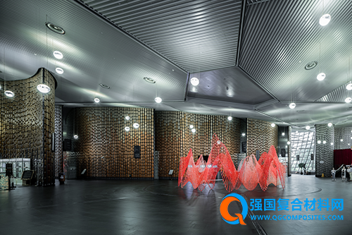 設(shè)計師的設(shè)計理念是:回應(yīng)上海東方藝術(shù)中心的音樂表演,將聲波數(shù)字化,并轉(zhuǎn)化為優(yōu)美的幾何形態(tài),三種不同的聲波在空間中此起彼落,如同交響樂中不同樂器的演奏,同時亦有合聲,聲波重合后形成了可以進入裝置的開口。這些聲波相互高低起伏,塑造出高低連綿交織的一個界面。界面呈現(xiàn)連續(xù)的環(huán)形,為中央大廳創(chuàng)造了一個小尺度的圍合空間,那就是Red LaLa Land。