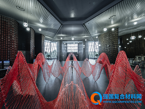 整個裝置由玻璃纖維復(fù)合材構(gòu)成,色調(diào)以漸變紅色為主,由下往上從淺紅到深紅,創(chuàng)造出空間的溫暖感,也仿佛靈感的火焰。最后這個裝置直徑八米,最高高度達到3.4米,采用形式結(jié)構(gòu)一體化的設(shè)計,分成了16組纖維模塊,而總重量僅為240公斤。裝置采用了機器人數(shù)字化建造技術(shù)來完成。